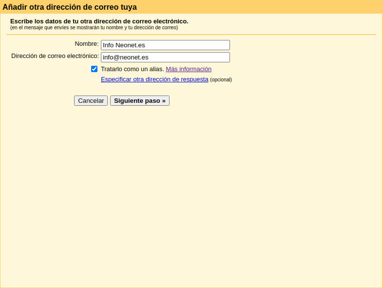 Al hacer clic en Añadir otra dirección de correo electrónico se abre una ventana emergente para comenzar la configuración de la cuenta de correo de empresa desde la que quieres enviar correo en Gmail. Puedes poner una etiqueta identificativa para la cuenta, lo normal es poner la misma cuenta que estás configurando (ej. tunombre@tudominio.com). También tienes que indicar la dirección de correo que estás configurando, igual, tunombre@tudominio.com. Tras esto pincha en el botón siguiente paso.