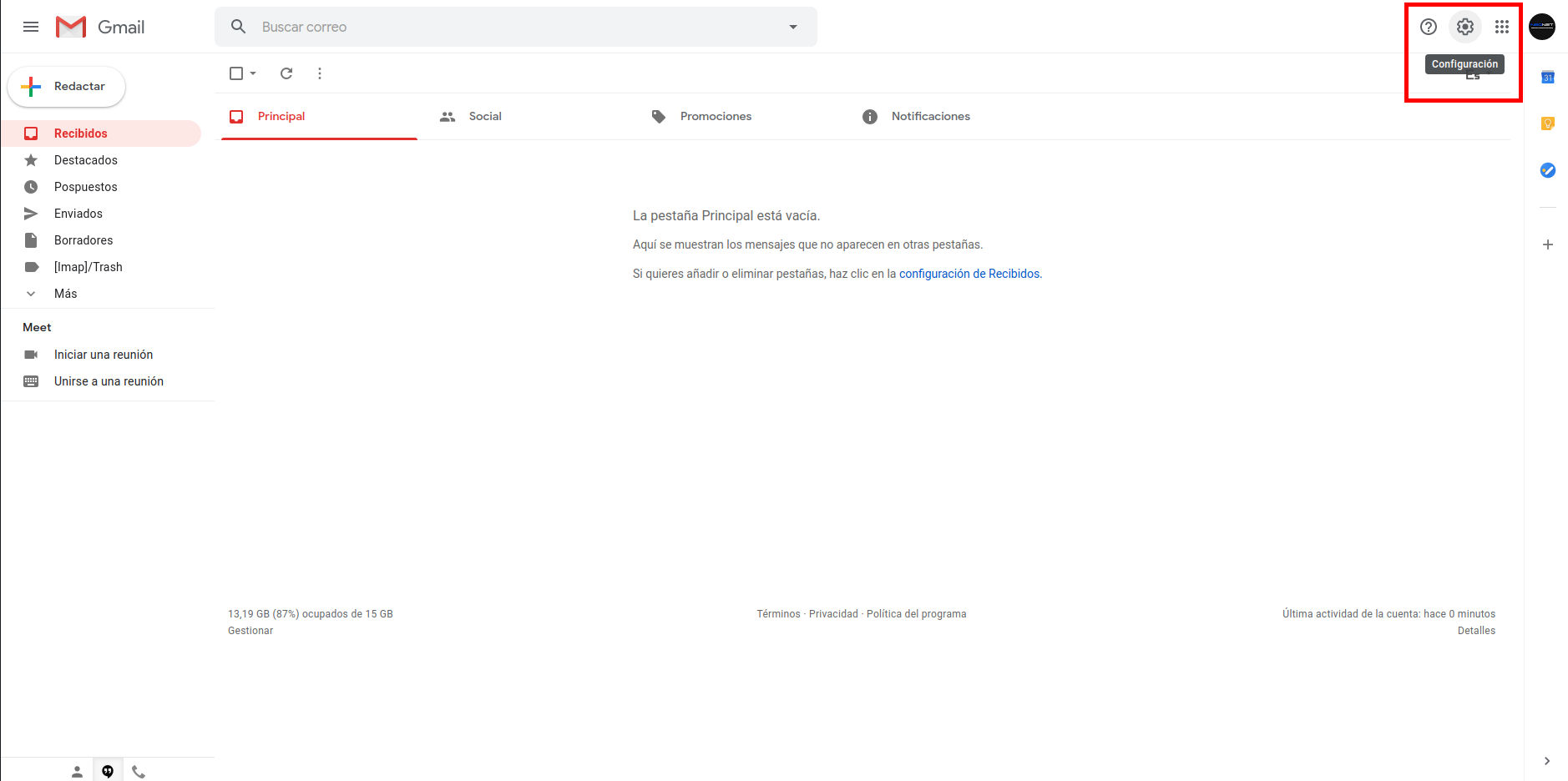 Bien, para configurar una cuenta de correo de empresa en Gmail comienza por iniciar sesión en tu Gmail, verás en la barra superior un icono tipo engranaje que nos lleva a configuración.