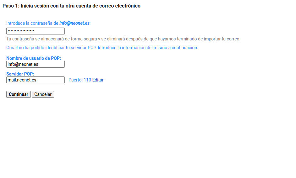 Con toda probabilidad te aparecerá un aviso advirtiéndote que Gmail no ha podido identificar tu servidor POP. Debes introducir los datos manualmente, en el primer campo introduce la contraseña del correo de empresa que quieres configurar, en el nombre de usuario introduce tu cuenta de correo de empresa (ej. tunombre@tuempresa.com) y en el servidor POP deja lo que detecta, debe ser algo como mail.tudominio.com. El puerto puedes dejar el 110 tal como aparece, pero mejor prueba con el puerto 993 para utilizar tu certificado SSL (totalmente recomendado).