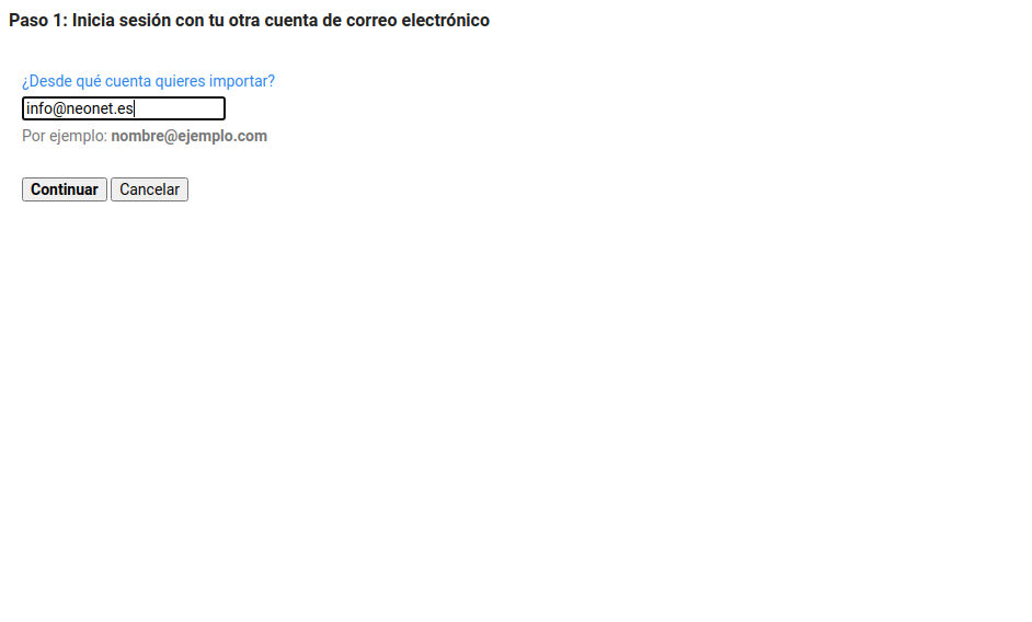 A continuación verás la opción «Importar correo y contactos«, haz clic sobre el enlace y se abrirá un ventana para introducir el correo que quieres gestionar.