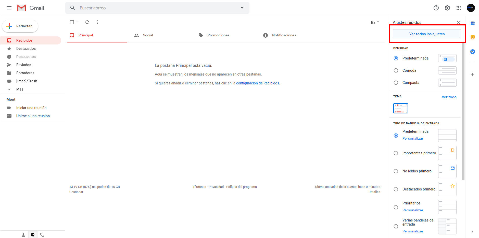 Al pulsar aparece un desplegable con un botón «Ver todos los ajustes» en la parte superior, haz clic para abrir las opciones de configuración.