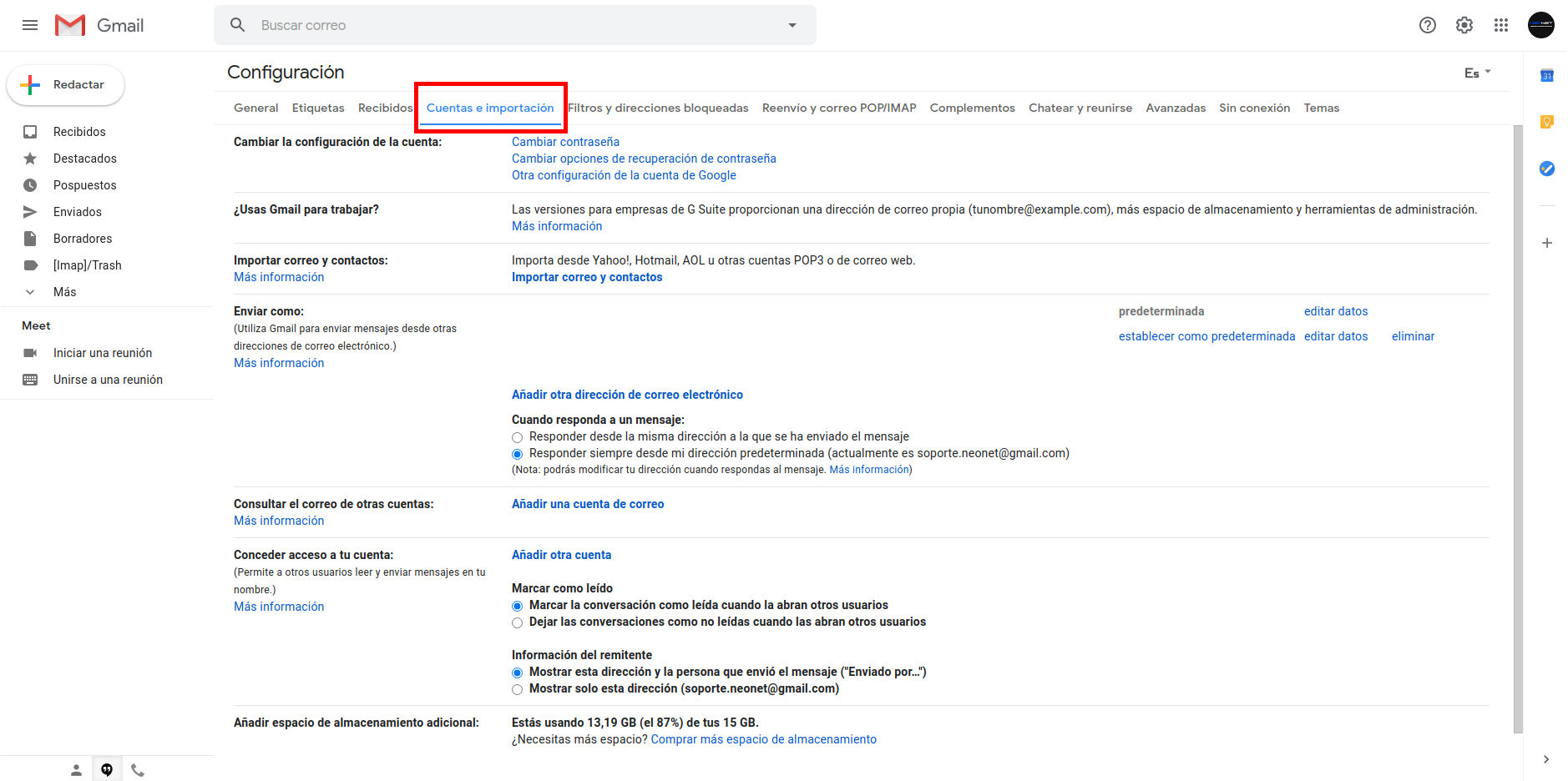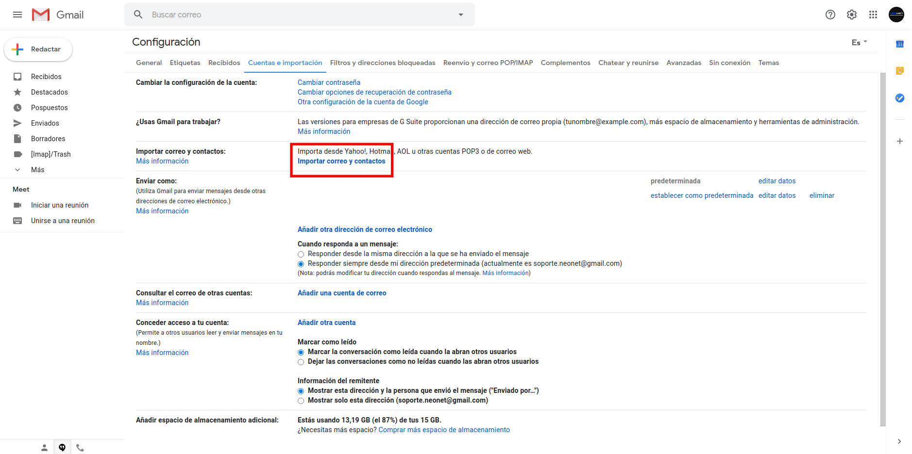 Ahora verás varias pestañas en la parte superior, haz clic en «Cuentas e importación«, desde aquí podrás configurar la cuenta de correo que quieres gestionar.