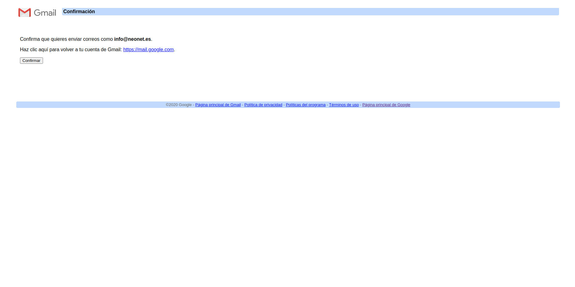 Una vez realizada la verificación aparece la última ventana para completar la confirmación y permitir a Gmail el envío de correo de tu cuenta de correo de empresa. Simplemente haz clic en el botón Confirmar.
