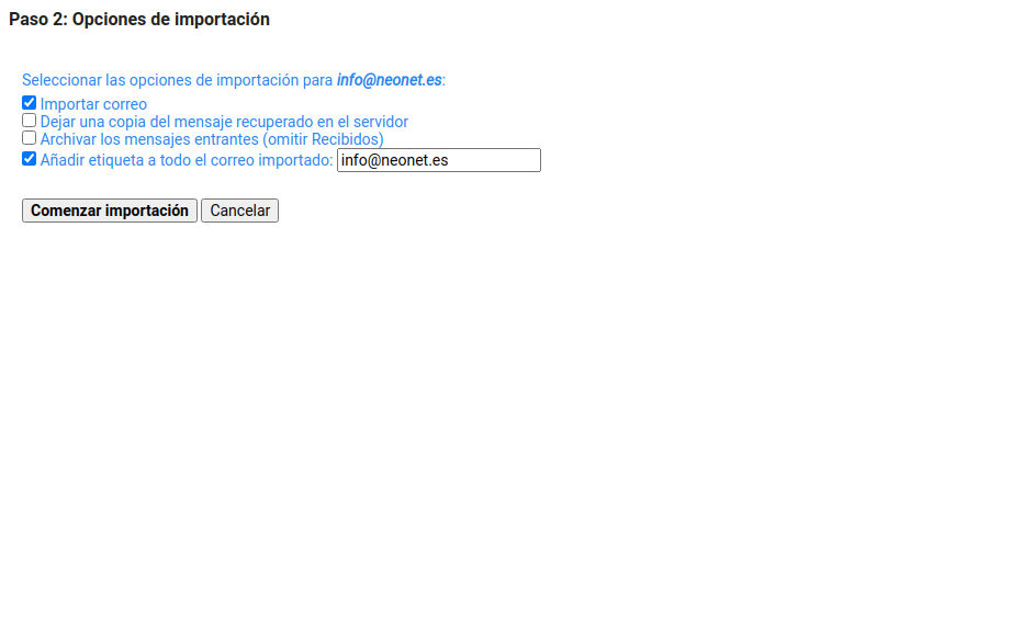 Si todo ha ido bien aparece el segundo paso en la ventana emergente con las opciones de importación, aquí puedes dejar una copia recuperada en el servidor y añadir una etiqueta para identificar el correo que llegue a Gmail desde tu cuenta de correo de empresa.